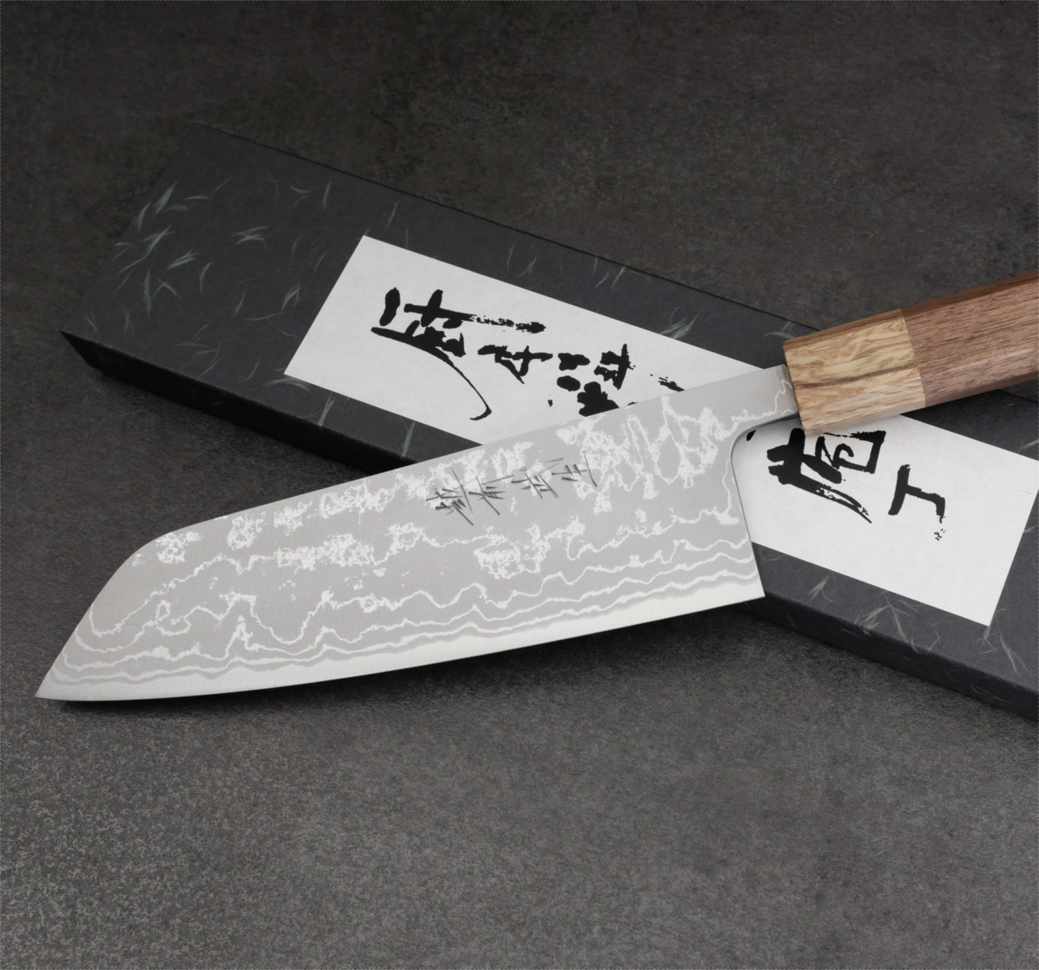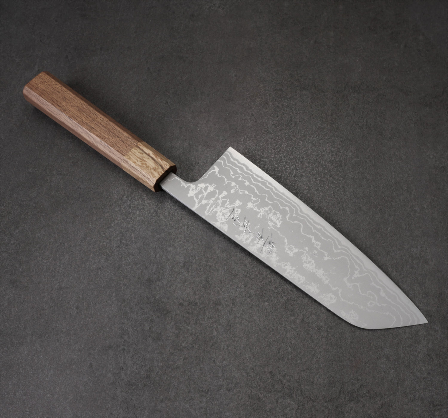 Santoku knife with a 185 mm blade in Aogami #2 carbon steel. The handle is octagonal, crafted from walnut with a light oak ferrule.
