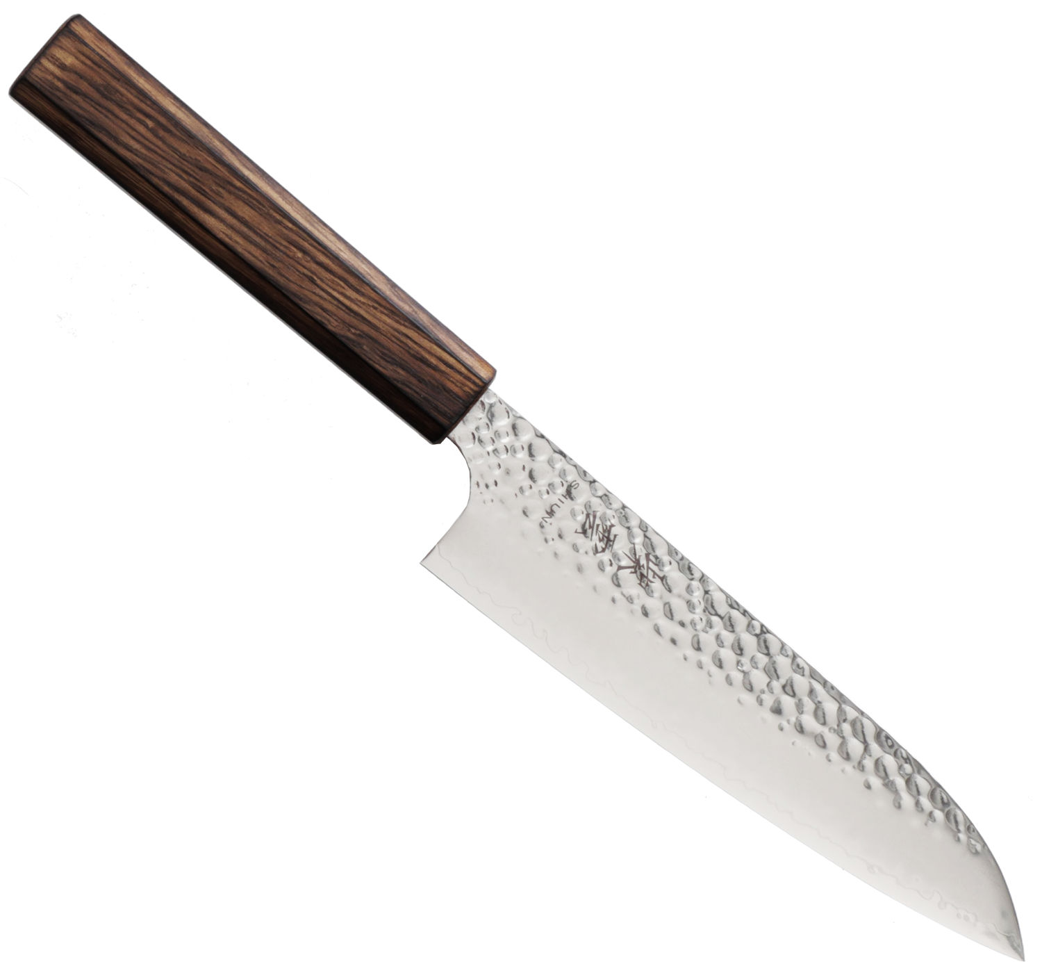 Shiun VG-10 is an incredibly affordable knife made from the hard stainless steel VG-10. The blade is thin and fine, and the knife comes with an impressive sharpness. The finish on the blade is called tsuchime, a hammered texture that gives a rustic impression. This is enhanced by the oak handle, which has been charred to a dark finish.