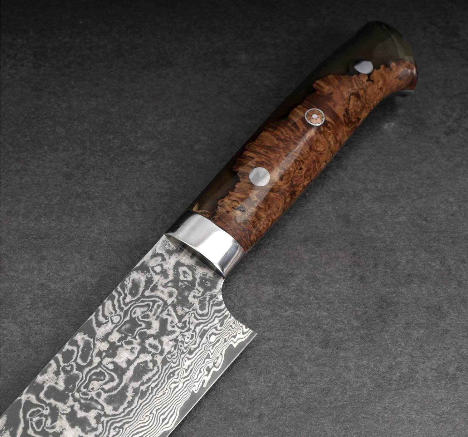 This luxurious piece is handmade in Saji’s workshop in Takefu, Japan. It is a limited edition featuring a handle made from wood and transparent epoxy. The hand-forged blade is constructed from multiple layers of nickel damascus steel with a core of stainless powder steel. The knife is delivered in a beautiful kiribox with a red interior.
