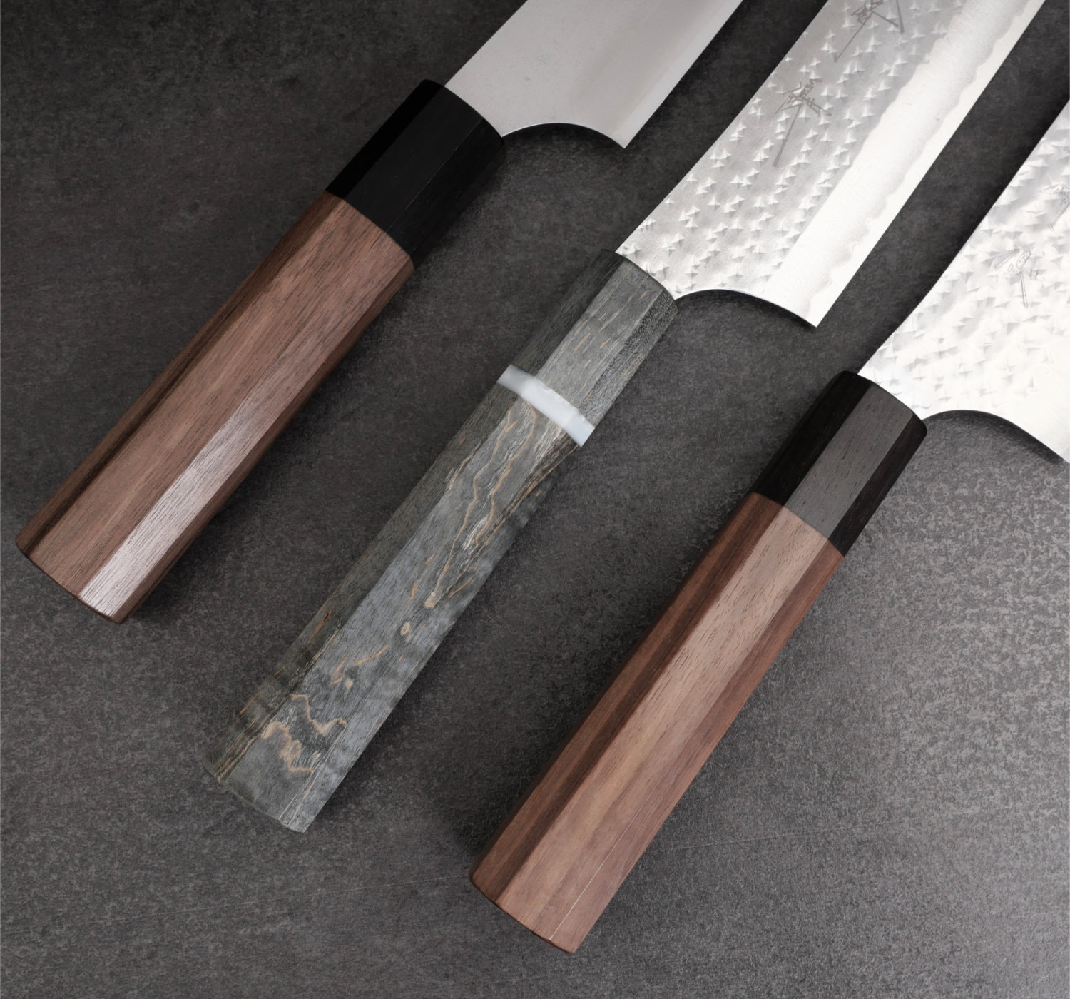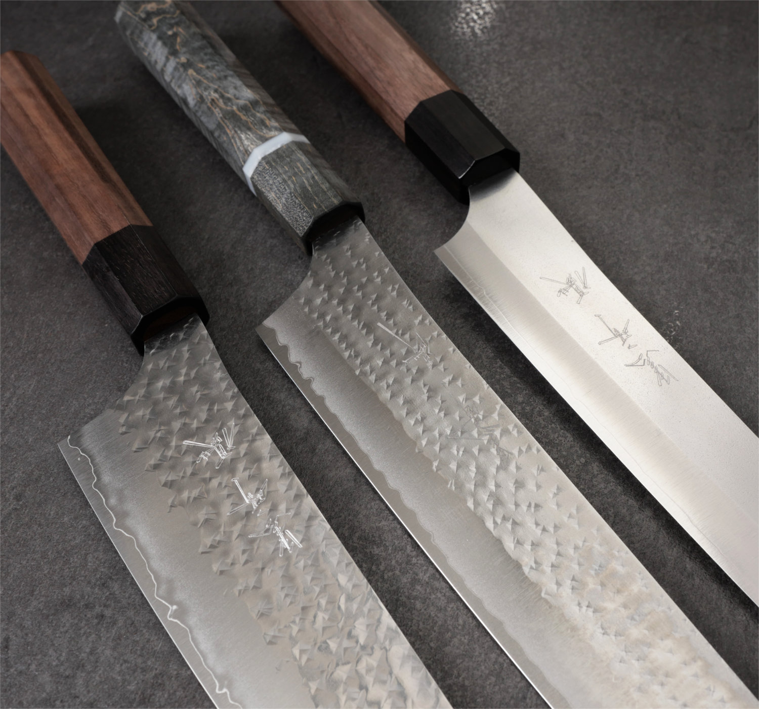 Featuring Aogami Super carbon steel core, the blade is razor-thin and offers extraordinary edge retention. The stainless cladding is hammered, darkened, and polished, creating a bold contrast with the shimmering edge.