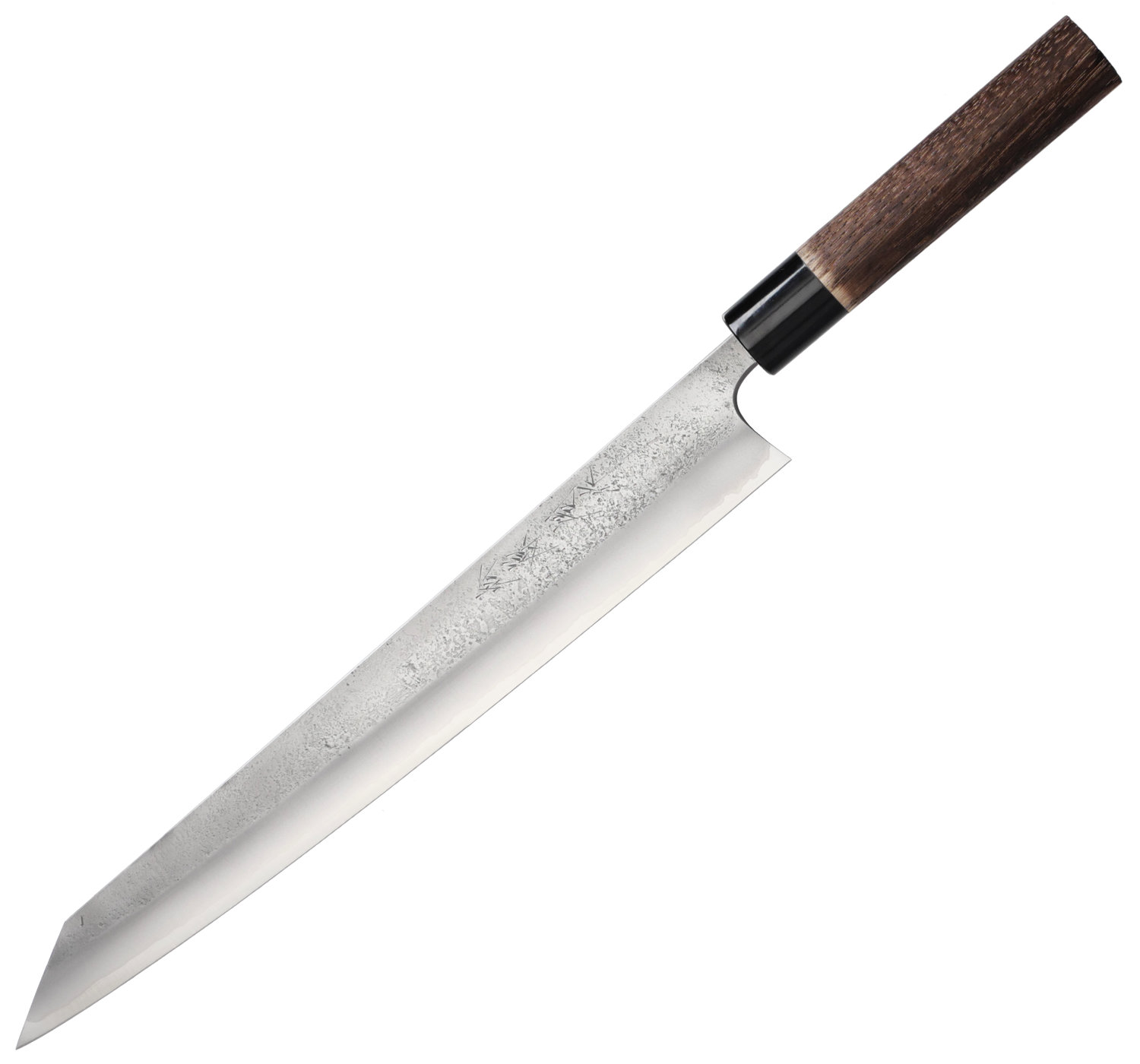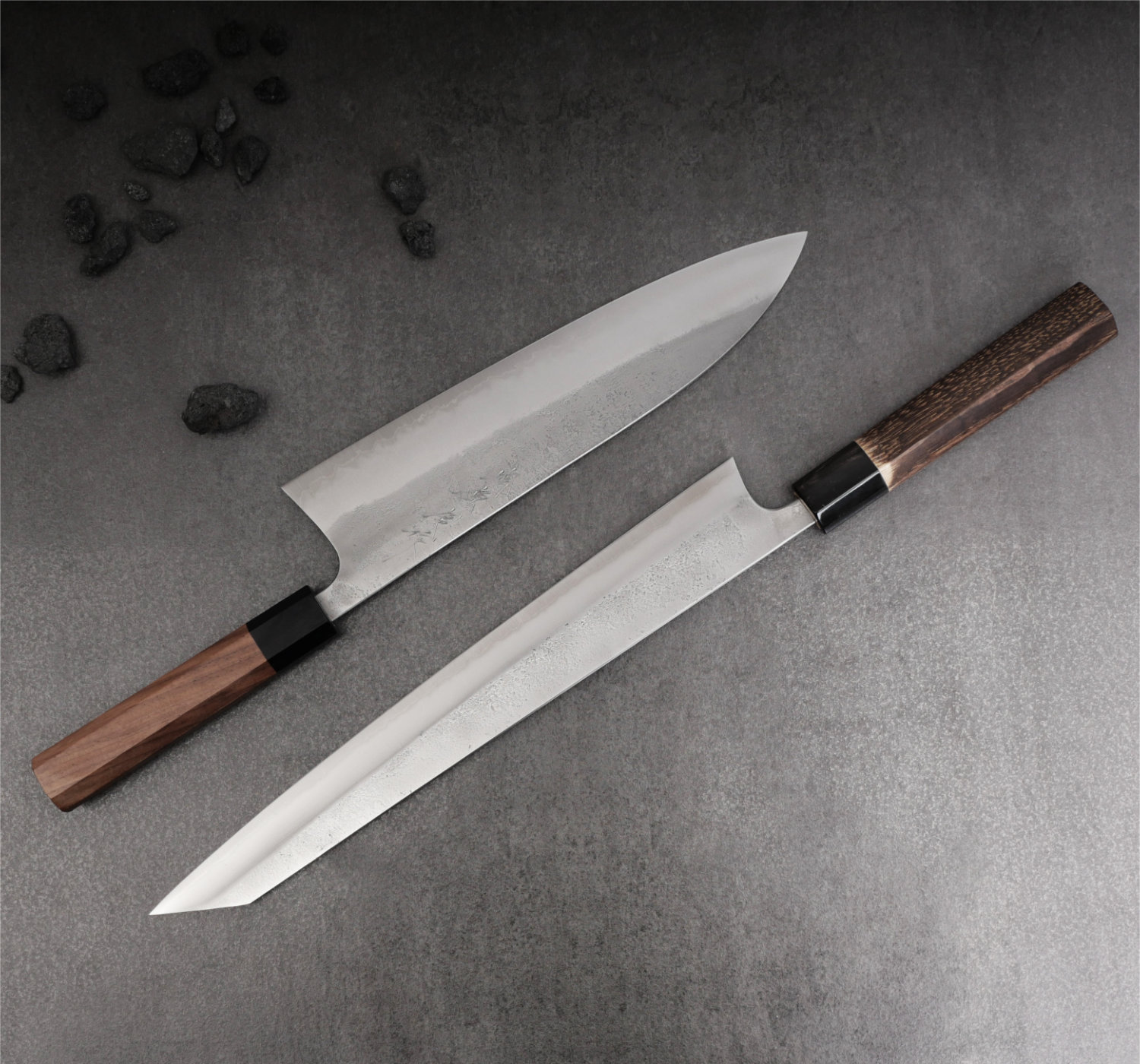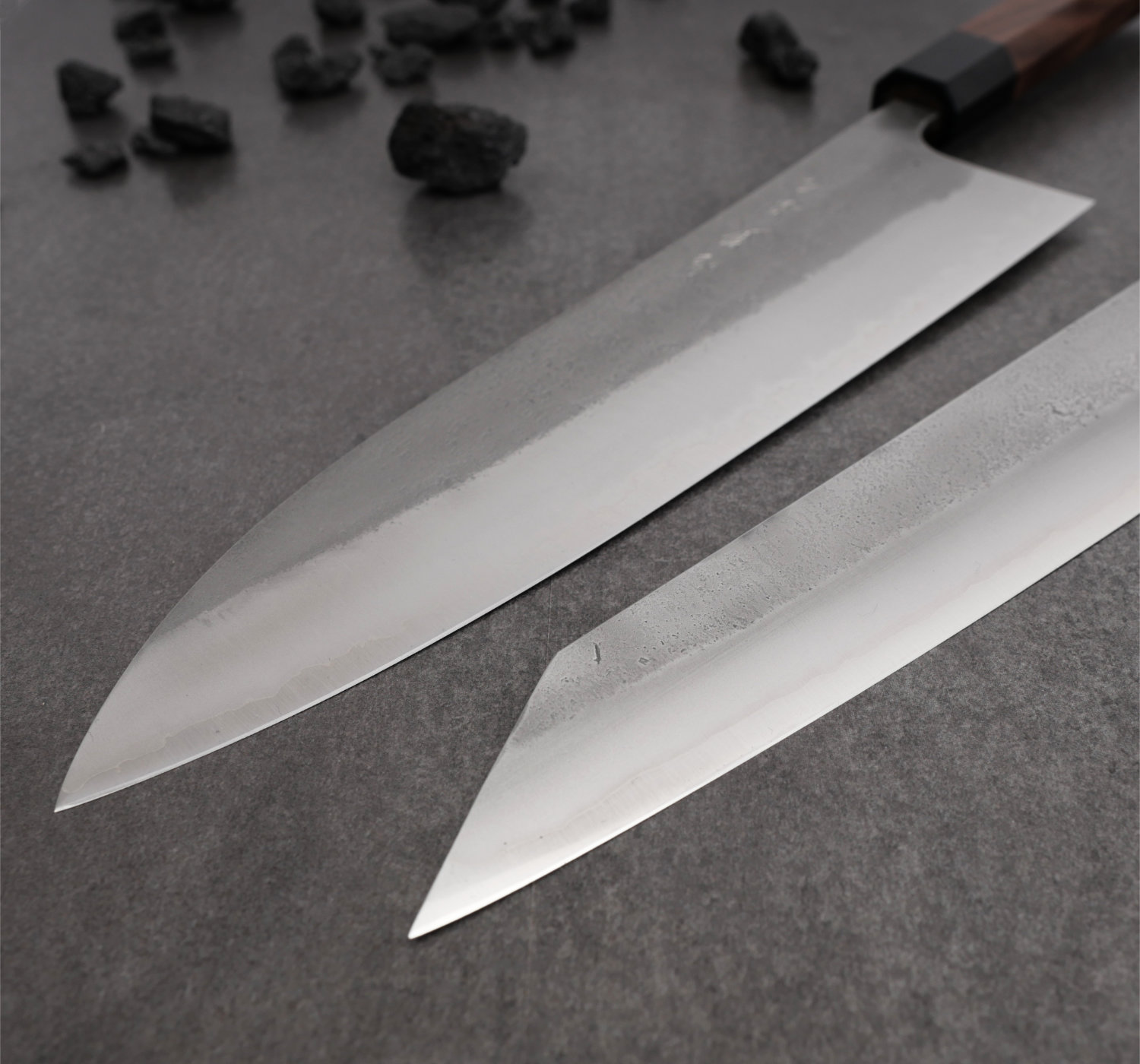 The core steel, Aogami #2, is a hard carbon steel that takes an aggressive edge and retains sharpness for a long time. The finish is called nashiji, a raw and textured surface. The knives have thin edges and feel superb in hand. The handle is octagonal and made from walnut.