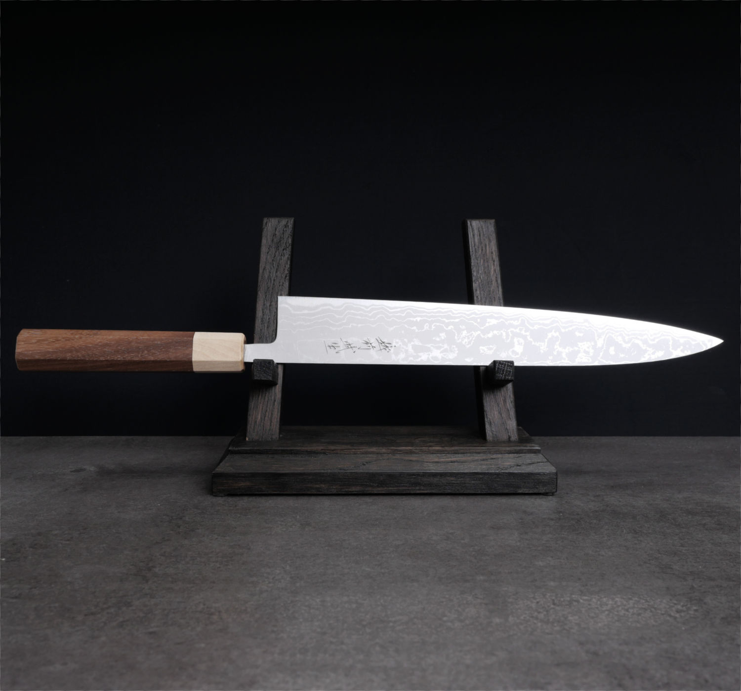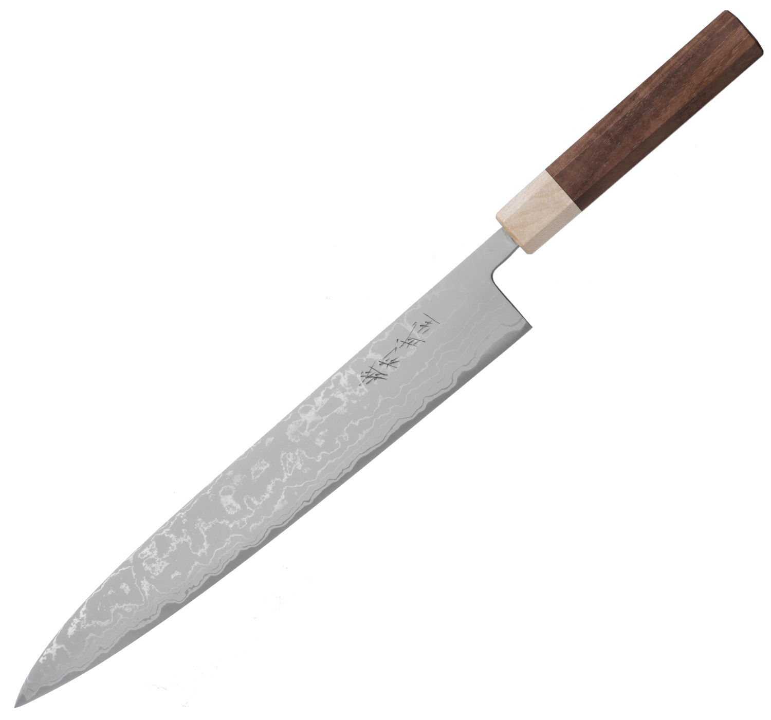 Sujihiki slicing knife with a blade that measures 270 mm. Octagon handle in walnut, with a ferrule in light maple wood.