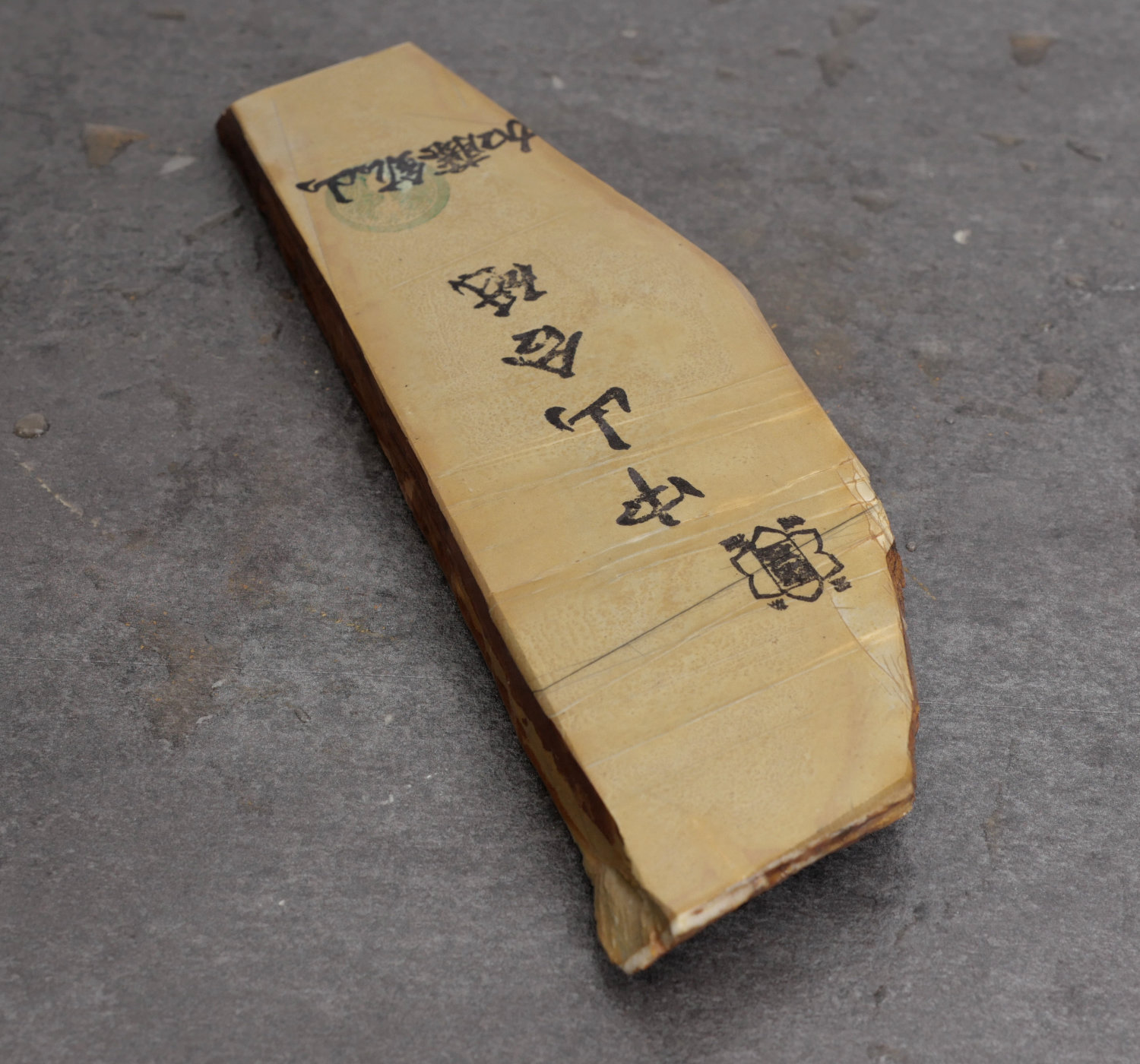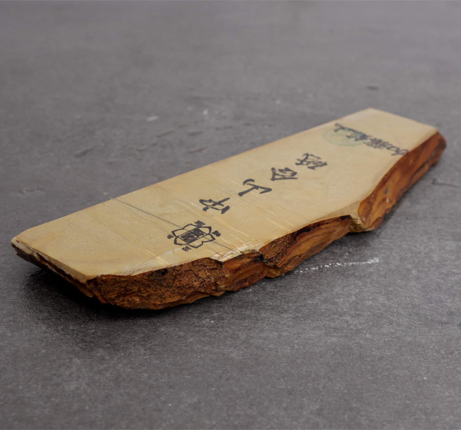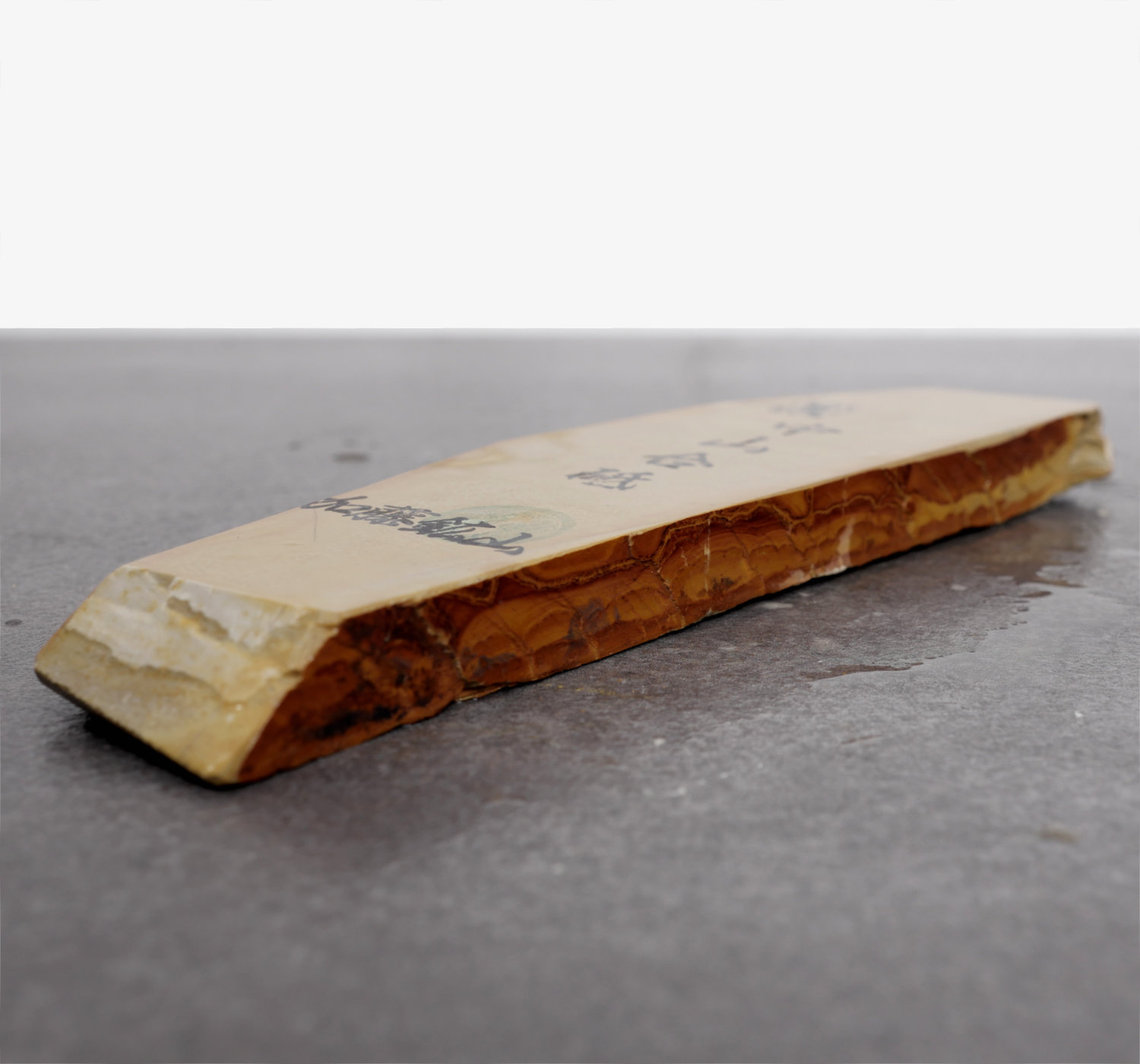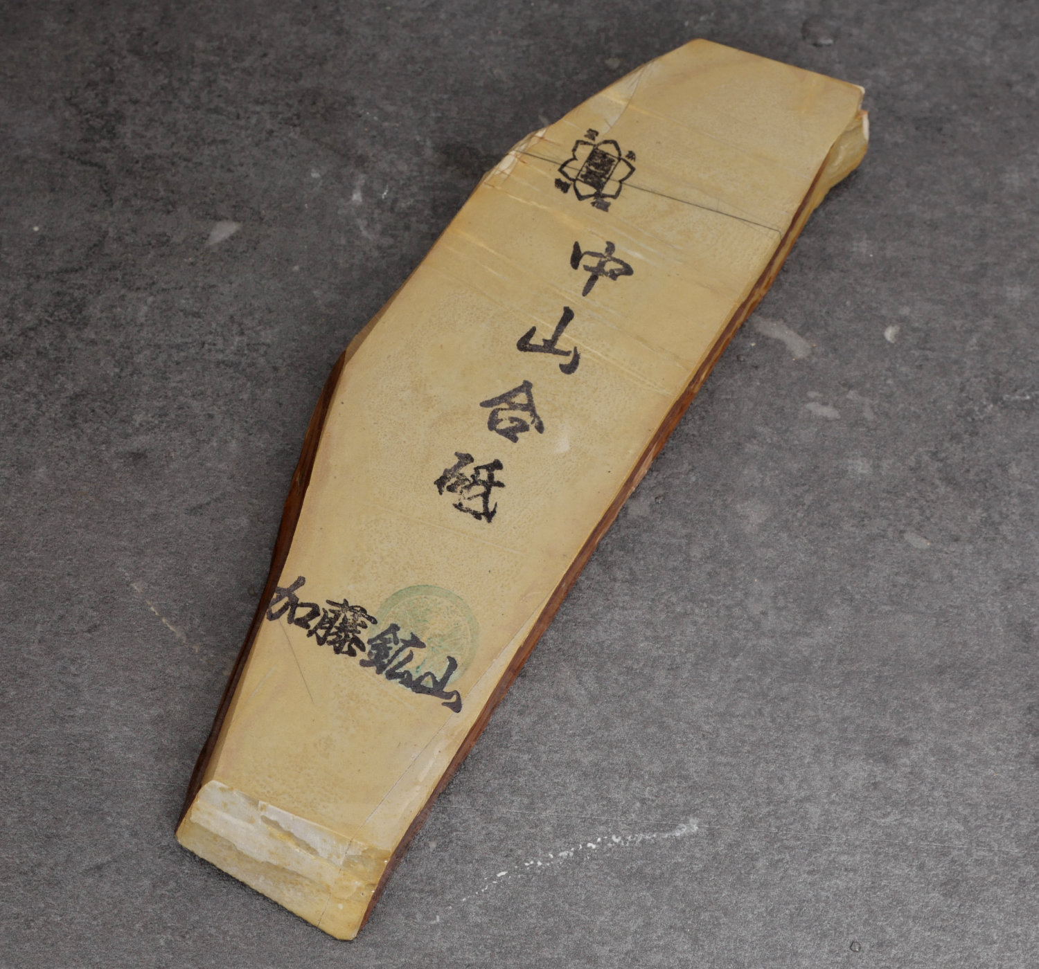 Nakayama natural stone for kasumi polishing. It provides good contrast between jigane and hagane. Not mirror-like, but with subtle shades of light gray.