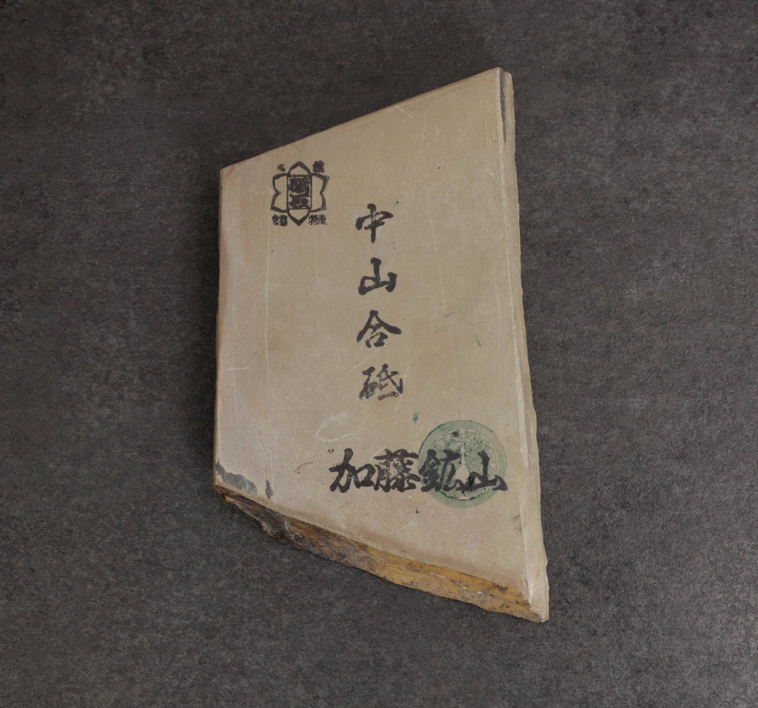Nakayama natural stone for kasumi polishing. It provides good contrast between jigane and hagane. Not mirror-like, but with subtle shades of light gray.