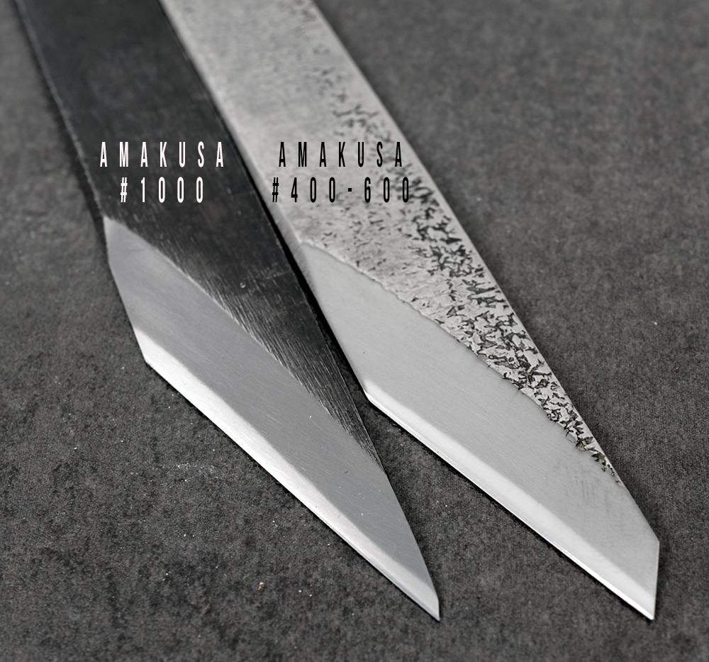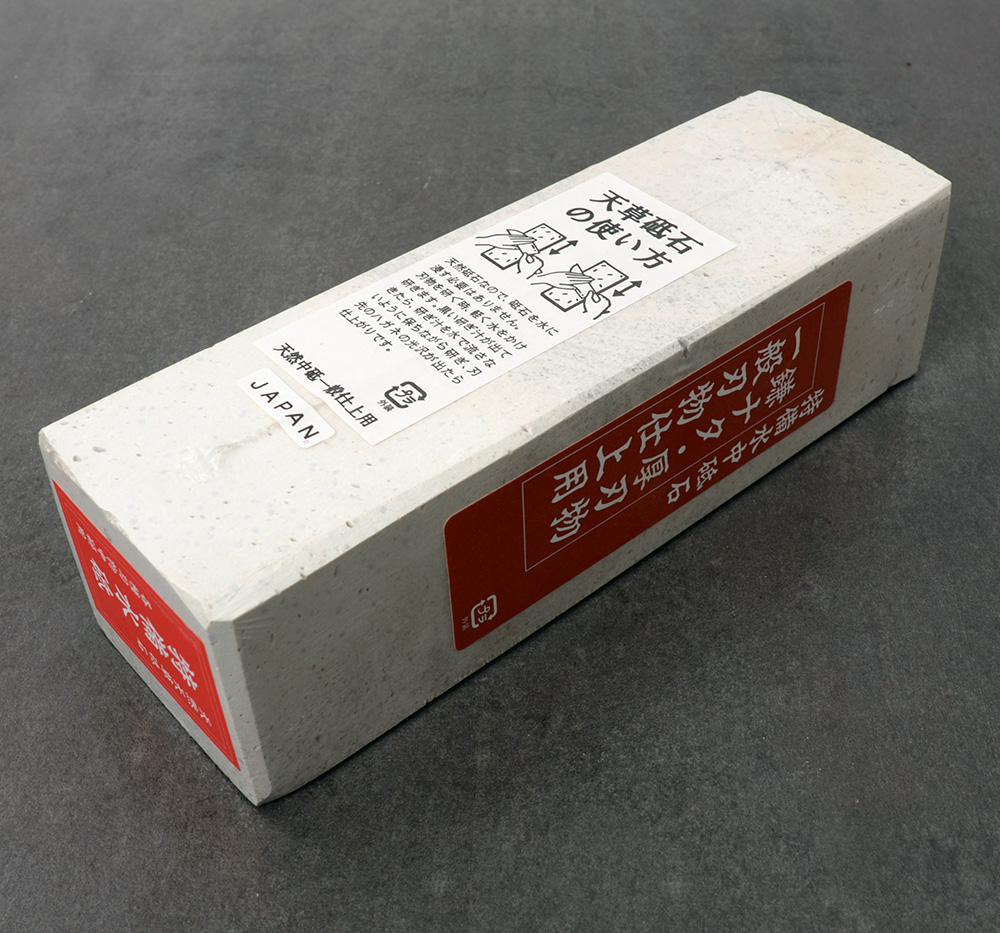 This Amakusa natural stone is medium coarse and provides a covering kasumi finish. It creates fine contrasts on knives with an iron cladding, and we estimate that a comparison to a synthetic stone would be equivalent to a grit of approximately 1000. The advantage of using a natural stone is that the scratch pattern it creates is easier to remove compared to the deep scratches created by a synthetic stone. Therefore, this stone is excellent as a finishing stone in the medium segment.