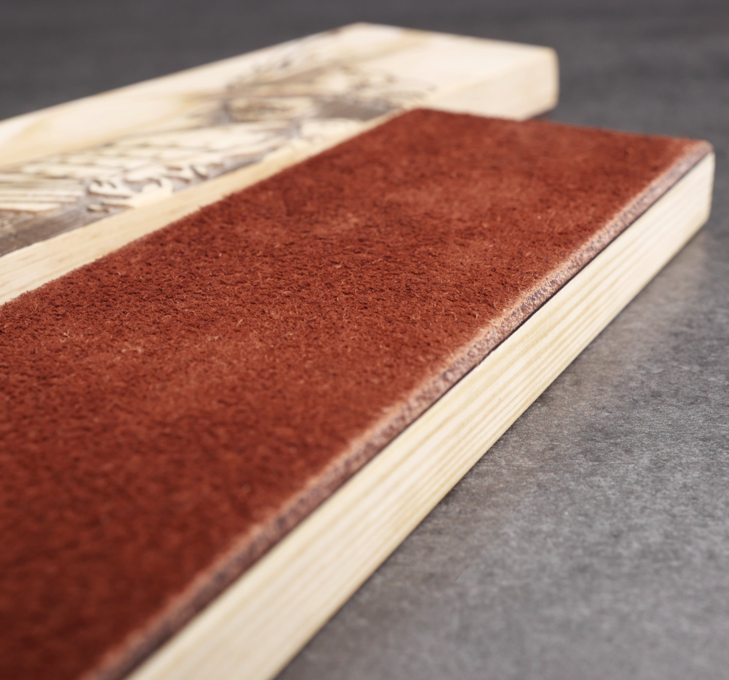 Mounted on a base of Swedish pinewood. The bottom of the stropping block is laser-engraved with a samurai. The wood base has been treated with mineral oil and beeswax for both protection and a lustre. The strop block matches the dimensions of Shapton sharpening stones, making it a perfect fit in a sharpening stone holder. This adds an extra step in your sharpening process, effortlessly removing the last burr and delivering a razor-sharp edge.
